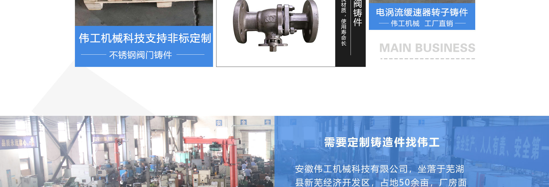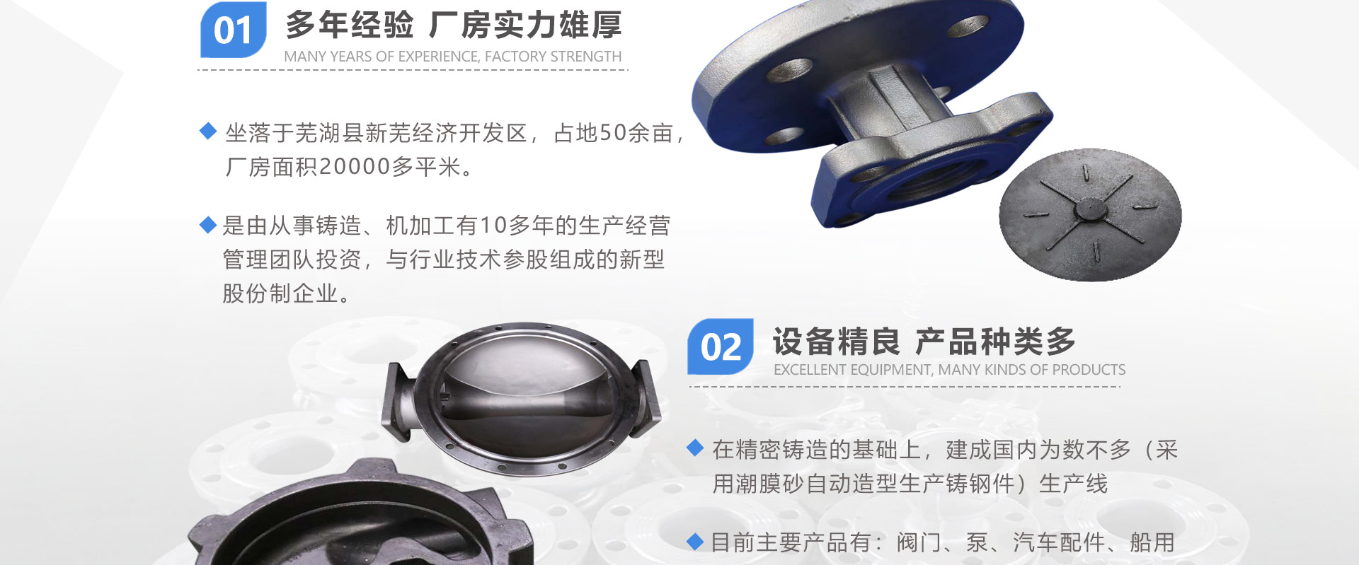 安徽偉工機(jī)械科技有限公司,坐落于安徽蕪湖新蕪經(jīng)濟(jì)開發(fā)區(qū),是一家専業(yè)從事鑄造產(chǎn)品設(shè)計(jì)、研發(fā)、生產(chǎn)、銷售于一體的企業(yè),公司為客戶的產(chǎn)品提供多樣的技術(shù)支持與設(shè)計(jì),公司主要鑄造技術(shù)有潮模砂鑄造、硅溶膠精鑄工藝。主要產(chǎn)品有:不銹鋼閥門配件、泵閥配件、汽車配件、工業(yè)管道配件、工程機(jī)械配件、汽車配件等。材質(zhì)為:低合金鋼、304、316、316L、鉻鉬鋼、哈氏合金、碳鋼、雙相鋼等。公司已先后通過ISO9001和TS16949等多種體系審核,以完備的管理手段和齊全的檢測(cè)設(shè)備滿足客戶需求,進(jìn)的設(shè)備,専業(yè)的技術(shù),嚴(yán)謹(jǐn)?shù)墓芾恚€(wěn)定的質(zhì)量。服務(wù)客戶,鑄造未來,偉工誠(chéng)摯的歡迎新老客戶共同商洽合作